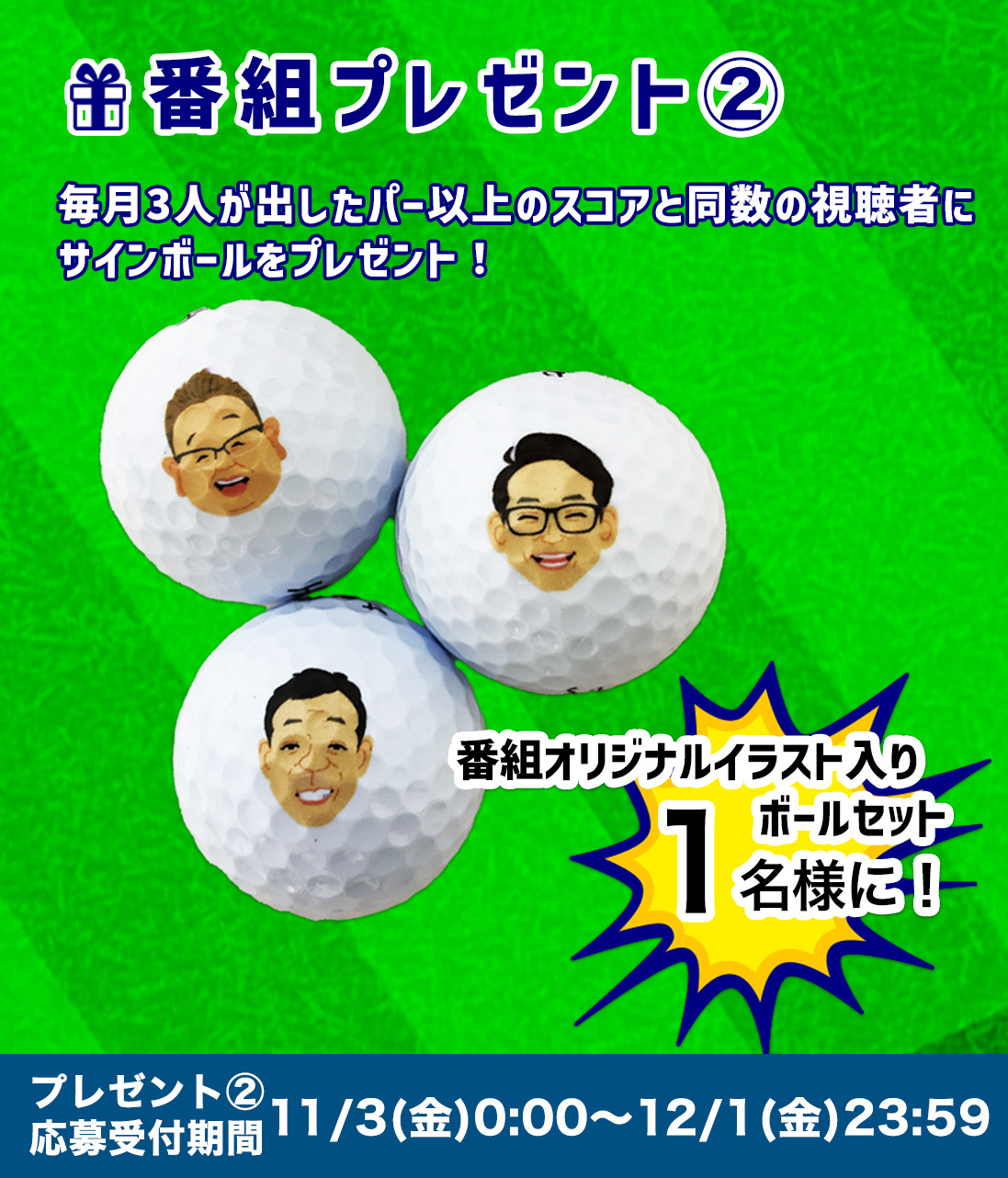 毎月、出演者3人が出したパー以上のスコアと同数の視聴者にサインボールをプレゼントいたします!