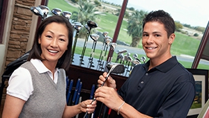 ゴルフ場、ゴルフ練習所ロビーなどで