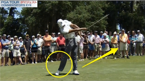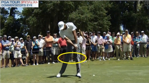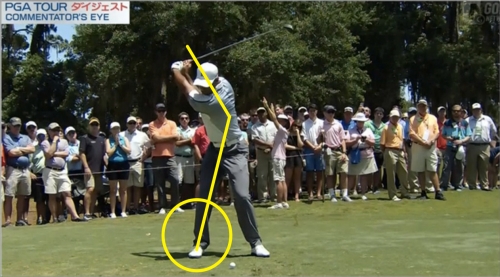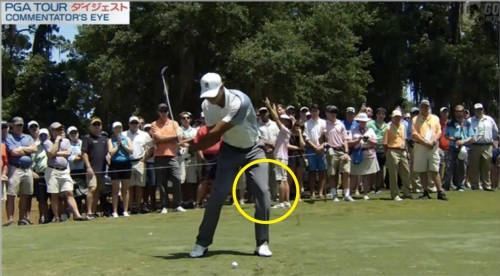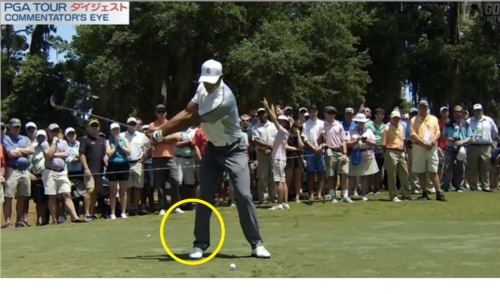 「トップでも右サイドに残ったスイングで、元々タイガーの悪い癖はダウンスイングから入ってくる時にひざが跳ね上がっていく傾向がありました。これが飛ばしの一つの方法でもあったのですが、今はたいぶ押さえられています。」