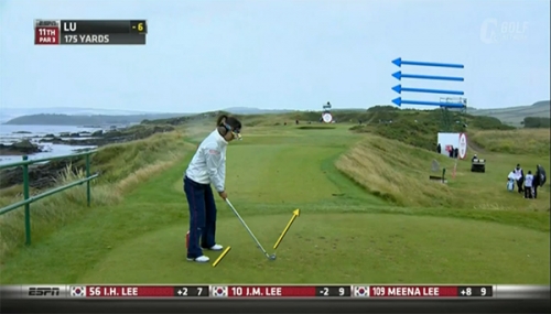 「次はピッチショットのリリースについて、追い風ではボールがふだんより飛びます。キム・ヒョージュの13番などはリリースを誤ったため、ボールは風に運ばれてグリーンをオーバー。アゲンストの時は逆にボールがもっと手前に止まるため、やはり正しい攻略法とクラブの選択が求められます」
