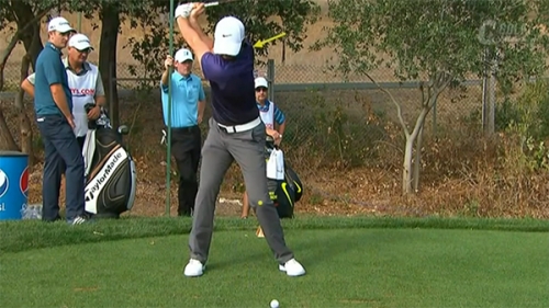 「ダウン・スイングで体重をしっかり左足に移動しています。そして、パワーの源は上半身と下半身の捻転差にあります。切り返しで下半身がターゲット方向に動き始めても、上半身は時計回りの回転を続け、下半身とのねじれの差が大きくなっています。背中がターゲットを向くまで、肩をしっかり回していますよね。飛ばし屋と呼ばれる選手を見て明らかなように、捻転差が大きければ大きいほどパワーが増します。ゴルフの歴史を振り返っても、マキロイほど捻転差が大きい選手はそうはいません」