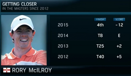 「上は2012年以降、マキロイのマスターズでの成績とスコアです。2011年、最終日の後半、自滅して優勝を逃したあと、2012年以降、成績は良くなる一方です。マスターズを制するには72ホール中50ホール以上でパーオンが必要だと言われます。マキロイは、2014年、52ホール、今年は53ホールでパーオンしました。初日のマキロイのスイングは素晴らしかったですね」