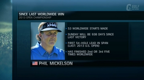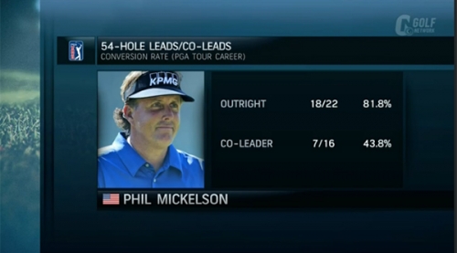 過去にミケルソンが最終日をトップで迎えた大会では、優勝の確率は82パーセント近く。タイガー・ウッズほどの数字ではないかもしれないが、充分にすごい数字だ。