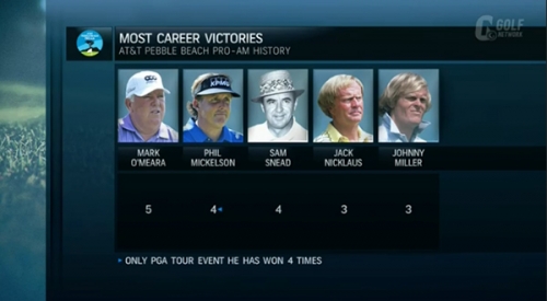 トリップ・アイゼンハワー 「ショットの調子がいいミケルソンだったらこのスコアでも驚きません。ところが、今日パーオンできたのはたったの半分。3番ホールでは、ティーショットでバンカーに入れてしまいましたが、完璧なピッチショットを披露し、問題なくパーを拾います。このようなプレーのおかげで、今日は一度もボギーを出しませんでした。ショートゲームでここまで自信を持つことができれば、どんなにショットが悪くてもスコアをまとめることができます。AT&Tペブルビーチプロアマで過去30年の間に66以下のスコアを出したラウンドの回数を数えてみると、ミケルソンはこれで11回目を記録したことになりました。ミケルソンがダントツです。67を含めると、なんと20回目のラウンドになります」