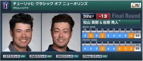 今年からダブルス戦として開催されている「チューリッヒクラシック」。最終日は雷雲の影響で6時間以上の中断を挟むタフなコンディションとなった。34位タイで3日目を終えた松山英樹と谷原秀人のペアはインコースの最終組でスタート。ホールごとに良いほうのスコアを採用するフォアボール方式で行われた最終日は7バーディ、ノーボギー「65」とスコアを伸ばしたが、通算13アンダーの32位タイで終えた。