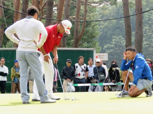 日本オープン2日目にはバーディチャンスにつけながらもカップに蹴られるシーンもあった松山。「課題はティーショットとパッティング。ピンポジションがもう少し楽なところになればバーディを獲っていけると思う。」と話していた松山。2日目ホールアウト後には昼食も取らずパッティンググリーンに直行し、練習を行った。