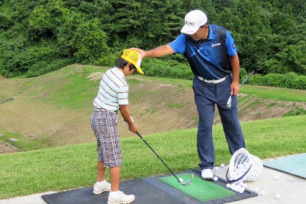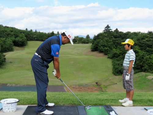 小学生を指導した中嶋プロは「スイングは建物と同じ。下半身(土台)がしっかりしていないとだめ。下半身が負けないように。」と本格的なレッスンに。教わったジュニアたちも真剣な眼差しで中嶋プロの指導を食い入るように聞いていたのが印象に残る。