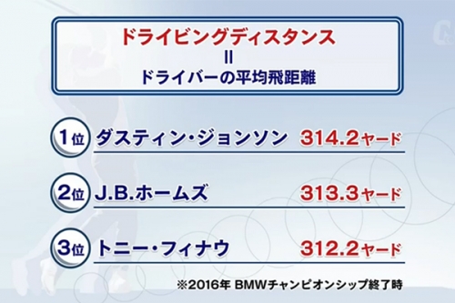 先ず、紹介するのはスタッツで見たPGAツアー選手の実力。今季、全米オープンで悲願のメジャー初優勝を飾ったダスティン・ジョンソンの強さを分析すると、ドライビングディスタンスで1位という圧倒的な飛距離だ。現在7,500ヤード前後の開催コースが多い中、昨年の平均飛距離は314.2ヤードで、パー5ではほとんど2オンし、パー4はウェッジで打つ場面が多い。平均飛距離で1番飛んでいることがダスティンの強みとなっている。