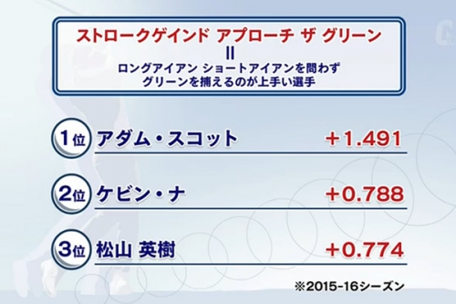 続いてショットの精度の数値を表すストローク・ゲインド・アプローチ・ザ・グリーンで1位に輝いたのはアダム・スコット。この数字はフェアウェイウッド、アイアン問わず、グリーンを狙うのが一番うまい選手ということ。スコットは世界で1番美しいスイングと言われており、PGAツアー屈指のショットメーカーだ。パッティング数値は苦しんでいるが、グリーンを狙うショットの制度が高いため、世界ランカーに君臨している。