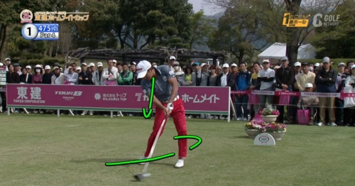 「身長が高くなくても飛ばす秘訣」 トップでクローズフェースの藤田とグリップを短く握る今平