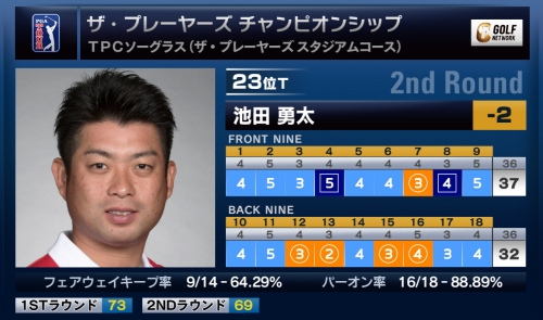 「ザ・プレーヤーズチャンピオンシップ」2日目、大会初出場の池田勇太が5バーディ、2ボギーの「69」をマーク。通算2アンダーの23位タイで決勝ラウンド進出を決めた。