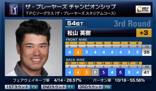 「ザ・プレーヤーズチャンピオンシップ」3日目、松山英樹は12番までは3バーディ、ノーボギーと完璧なプレーを見せていたが、13番パー3で2度池に入れて「8」と大きくスコアを落とす。その後も14番、16番でボギー。通算3オーバーの54位タイまでスコアを落とした。