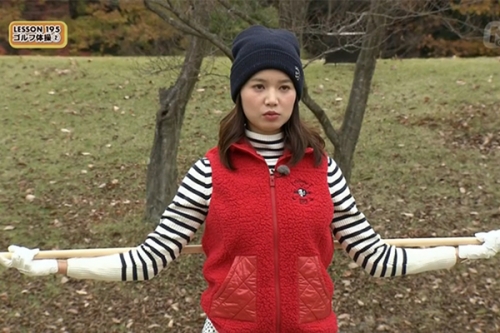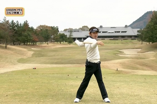 前回のレッスンでは、飛距離をアップさせる内藤コーチ考案の「ゴルフ体操」をご紹介しましたが、今回はさらにスキルアップしたトレーニングを行います。ゴルフの体操は朝や夜寝る前にやると体が動きやすくなりますし、朝スタート前に行うと早く体が温まります。特に体が硬くなりがちな冬場は効果的です。
