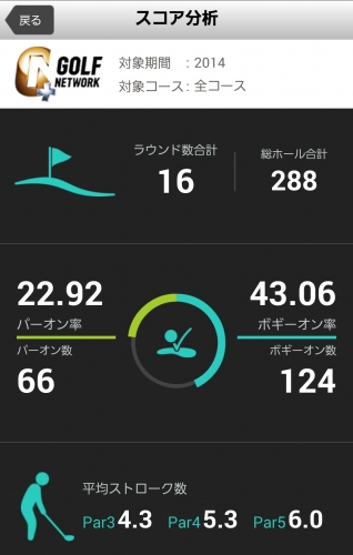スコア管理アプリ「GOLF NETWORK PLUS」なら、自分のプレーのパーオン率を算出することが出来ます。その日のラウンドでの成績はもちろん、これまでのすべての成績を集計したり、年度別で表示させたり、直近3ヶ月といった具合に期間を区切ることも可能です。その年その年で見てみると、自分のゴルフの成長度合いがわかります。