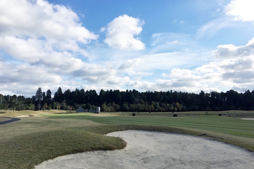 例えば、パー5の4番ホールでは、バンカー超えのグリーン左端で、二段グリーンの段を超えてすぐのところにピンが切ってあります。距離が少しでも足らないと、ボールは段の下に大きく戻されてしまい、大きめに打つと段の下に向かって打つパットが残ります。ピンを狙いすぎてグリーンを左に外してしまうと、難しいアプローチが残りますが、右の広い場所にグリーンオンすると、段をフックで狙うかなり難しいラインが残ります。