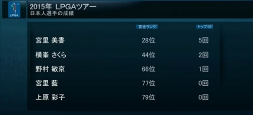 番組後半の話題は、LPGAツアーの2015年シーズンを戦った日本人選手。フル参戦したメンバーについてレックス倉本プロがシーズンを総括してくれました。下は日本人選手5人の賞金ランクとトップ10入り回数です。