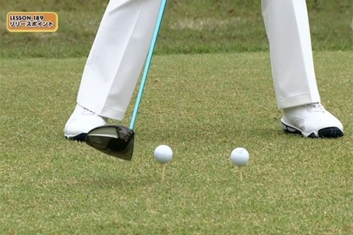 練習方法は、ティーアップしたボールのヘッド一個分後ろに、もう一本ティーを刺して、そのティーを打つような感じでスイングすること。素振りでもOKなので、本来のボールのやや手前をインパクトするような感じをドリルで養います。