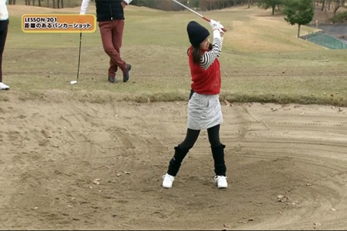 内藤コーチのアドバイス通りに打ったこころさんはナイスショットを連発!距離のあるバンカーショットを克服するには、まず「バンカー=サンドウェッジ」の固定概念を捨てることがポイントです。今から、明日から、ぜひお試しください!