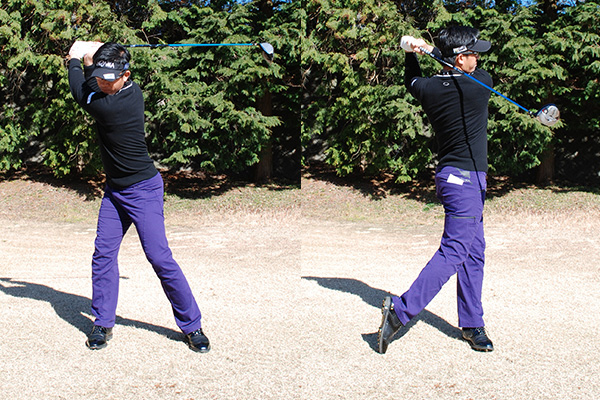 スイングするうえで私が一番気をつけていること。それは、リラックスすることです。特に意識しているのは、グリッププレッシャーが強くなり過ぎないこと。手に力が入ると体の回転が不足してしまい、手だけでボールを打つ、いわゆる“手打ち"になってしまうからです(写真?)。