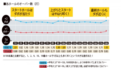 「ほぼ100を切る人」と「100が切れない、100を頻繁に叩く人」のデータを比較。まずは、各ホールのオーバー数を比べてみました。どちらも、スタートホールと最終ホールでオーバー数が増えていますが、100打ちゴルファーはほかのホールとの差が激しくなっています。とくに1番ホールはオーバー数が2.01打と、ダボ以上に。1番と10番ホールは、朝イチや昼休憩直後だから仕方がないのでしょうか?