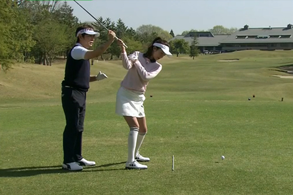 もともと左に向いてしまうクセがある佐藤さん。始動の直前、無意識に左足を体の後ろへ引いてしまっているようです。その原因について、内藤コーチは「スタンスの向きが変わってしまうのは、両腕の高さで右腕の方が高くなりすぎているせい。これは多くのアマチュアに見られる傾向です」と説明。