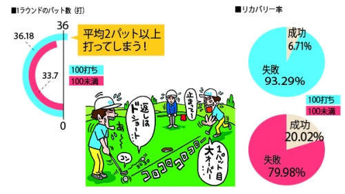 また、パット数の多さも100打ちゴルファーの課題。100打ちの1ラウンドのトータルパット数は36以上。3パットが必ずあって、平均2パット以下にならない。100未満との差は2.48パット。「あとちょっとで100が切れたのに…」と悲しい思いをするときは、パットのせいかもしれません。