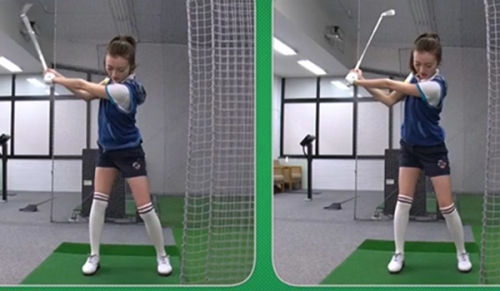一度90度を作ってしまえば、後は体の回転だけで打てるので、やらねばならない作業が減り、シンプルで効率の良いスイングになるのです。実際に佐藤さんが打ってみると、ドリル前のスイングとは違い、全体的に引き締まった印象。トップもヒジが持ち上がらないため自然とコンパクトなスイングに。