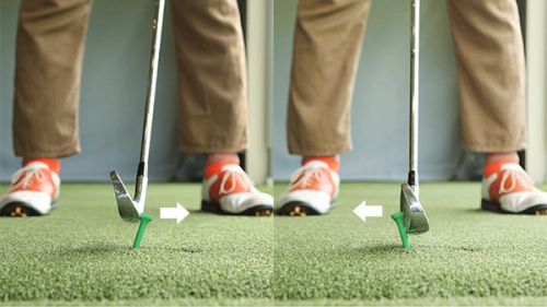 振り幅はバックスイングで左腕、フォローで右腕が地面と平行になるところまで。連続素振りを繰り返し、最下点が同じになるように行きも帰りもゴムティを打てば、正しいアームローテーションが身につきます。