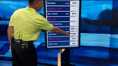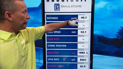 必要以上に大きなバックスイングをして身体を回さずにインパクトでフェースを返すと(写真1、2参照)、ダフりやトップ、そして引っかけてしまいます。こうすると、ボールの高さをコントロールすることは困難。このような打ち方をすると、40ヤードを打つつもりだったのですが、50ヤードも飛んでしまい、スピン量も5000回転ほどになってしまいました(写真3参照)。これはインパクトでフェースを返し引っかけてしまったことが原因なのです。