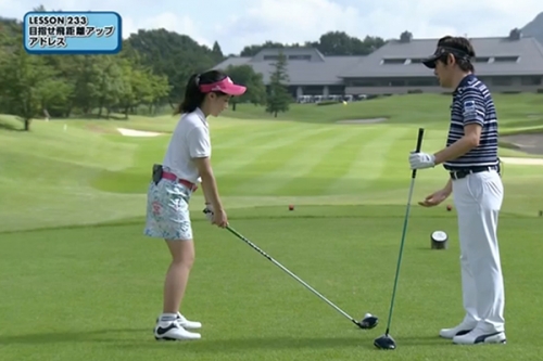 レッスン冒頭、「一番出てしまうと嫌なミスはなんですか」という内藤コーチの質問に対し、笑瓶さんは“引っ掛け"、安部さんは“右プッシュ"が出てしまうとのこと。スイングをチェックした内藤コーチは2人のアドレスを指摘しました。
