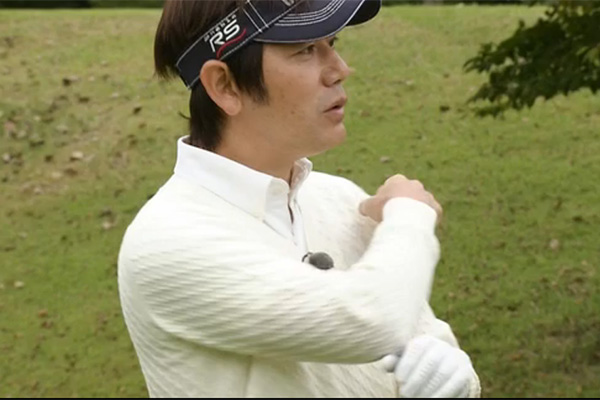 クラブを背中に担いでみてください。まずバックスイングしたら、そこから左のお尻を真後ろに引く動きでインパクト、そしてクラブを持っている右手が完全に左足の上にくるところまで体を回していきます。その際左ひざは伸ばしてください。