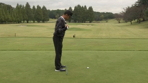 まず地面に真っすぐの棒を置いた状態で目標方向にしっかりとラインを合わせ、アドレス時にも肩がスタンスの方向を向くように構える意識して打つようにしているとのこと。