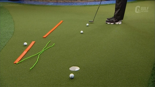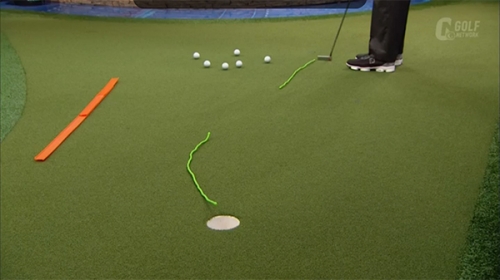 またラインの「入口」と「出口」を理解することも大切。カップ近くのラインがフック、出だしが真っ直ぐなラインと仮定した場合、このラインでボールが転がるということを何度も頭の中でイメージさせましょう(写真8参照)。「出口」をイメージする時は、ライン上のカップ手前にボールを何個か並べてカップインすることを思い描きます。ここでは4つ並べたので、カップインする最後の4回転をイメージ(写真9参照)。実際に打つ時は、一番手前のボールに当てることを心がけてストロークしてください。そうすると、4回転してカップインすることがイメージできるでしょう。一方、「入口」をイメージする時は、構えたら打ち出す方向(写真10参照)、そして逆方向にラインを目で辿り、そのラインに向かって打ち出してください。