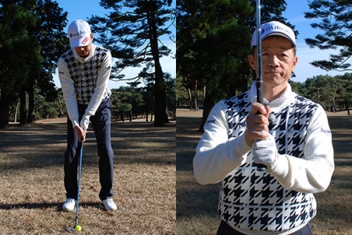 上げるアプローチの打ち方は次回で詳しく説明しますが、上げる、転がすに関係なく、アドバイスをひとつ。それは、クラブを短く持たないことです。アマチュアゴルファーの中には、短い距離を打つ場合、クラブは短く持つのが当たり前だと思っている人が多いようですが、短く握るとクラブのヘッドバランスが軽くなってしまうので、手打ちになりやすくなります。練習でも本番でも長く持ったまま、振り子運動の振り幅で距離を調整することをお勧めします。