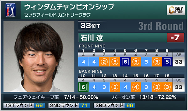 上り2ホールで連続バーディをマークした石川は、前日の66位タイから33位タイに大きく順位を上げている。