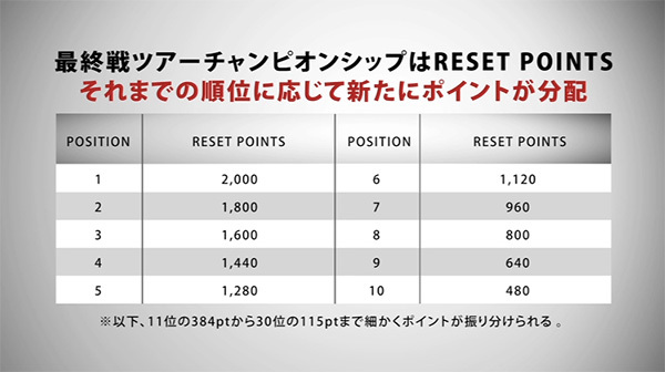 最終戦の「ツアーチャンピオンシップ」まで勝ち進んだ30名は、それまでの獲得ポイントがリセットされ、1位=2,000ポイントから順位に応じてポイントが新たに配分されます。このポイントリセットによって、圧倒的大差のない緊迫した状況で選手たちはプレーすることになります。最終戦を終えた時点で、ポイントランキング最上位の選手に、PGAツアー年間王者の栄冠と、1000万ドル(約11億円)というビッグボーナスが与えられます。