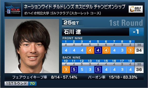 石川遼は4バーディを奪うも後半スコアを崩し、1アンダー70の25位タイスタートとなった。