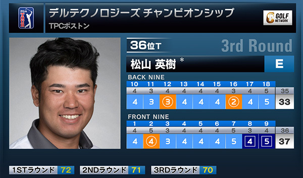 松山英樹は、12番で見事なアプローチを見せ、この日最初のバーディをマーク。16番では、約7メートルのバーディパットを沈め、スコアを伸ばす。1アンダー70でホールアウトした松山は、通算イーブンパー36位タイで最終日を迎える。