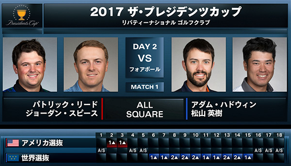 松山英樹はこの日、アダム・ハドウィン(カナダ)とペアを組み、ジョーダン・スピース&パトリック・リード組と対戦。一時はリードを奪う展開も、終盤にポイントを連取され、オールスクエアで終えた。