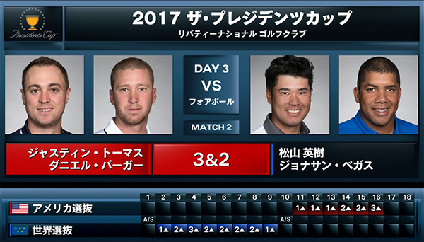 午前のフォーサムに欠場した松山英樹は、ジョナサン・ベガス(ベネズエラ)とペアを組み、ジャスティン・トーマス&ダニエル・バーガー組と対戦。絶妙なアプローチを披露するなど序盤で3アップとするも、後半に逆転を許し、3&2で敗戦した。