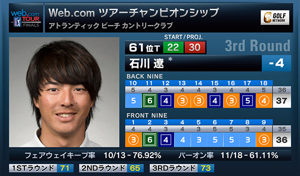 前日45位タイに順位を上げた石川遼は、13番パー4でこの日最初のバーディ。続く14番でもナイスショットからバーディを奪う。この日2オーバー73とスコアを落とした石川は、61位タイに後退している。