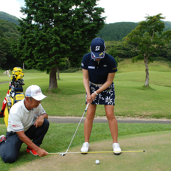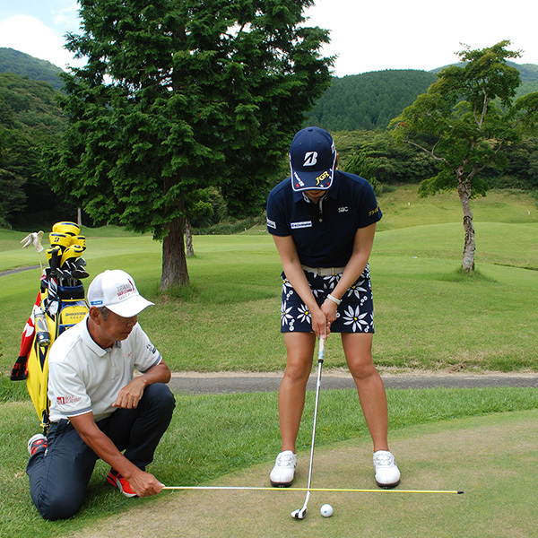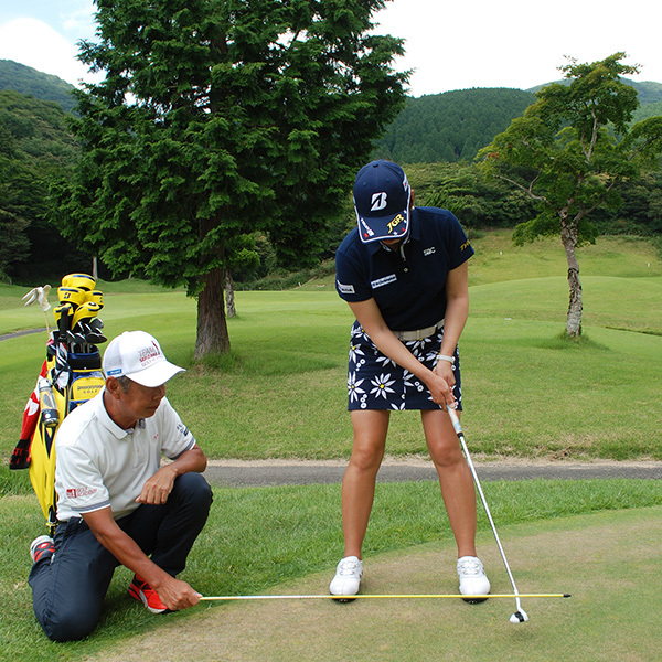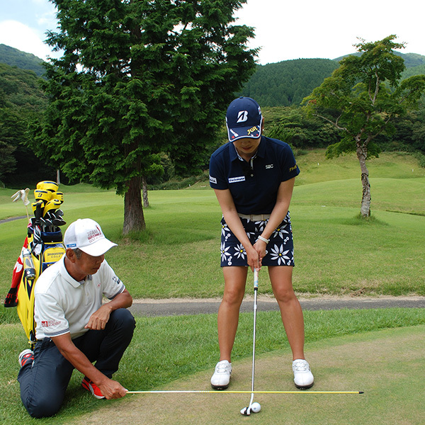 練習のときはもちろん、試合のときも必ずやっているのは、写真①~③のようにスティックを使ったドリルです。スティックの高さが地面から10センチ前後になるようにキャディさんに持ってもらい、実際にパッティングをする練習法です。