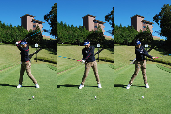 ジュニアの頃から、「飛ばないけど、真っすぐ飛ぶ」というスタイルでやってきたわけですが、さすがにプロのツアーともなると、このままでは優勝はもちろん、常時優勝争いに絡むことや、シードをキープし続けることが難しい。そこで取り組んだのが今回のスイング改造です(同②)。