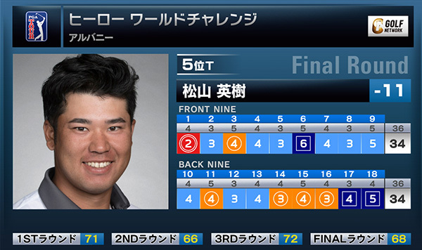5位タイからスタートした松山英樹は、1番パー4のセカンドを直接カップに入れるスーパーショットを披露。その後も5バーディを奪うなど4アンダー68でホールアウト。通算11アンダーとスコアを伸ばしたものの、連覇には手が届かなかった。