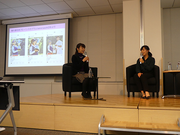 第1部は、医療ジャーナリスト増田美加さんを迎えてのセミナーが行われました。国内での羅漢率や乳がん検診などをテーマに、特にマンモグラフィの検診だけでは見つけづらいケースがあり、月1回のセルフチェックが重要と呼びかけているというところでは、青木プロはうなずきつつ、ときには質問も交えながら興味深く聞いている様子でした。