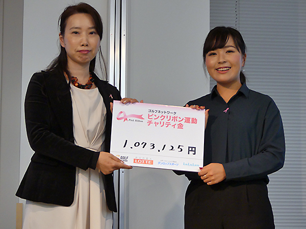 なお、同チャリティ活動を通じて寄せられたチャリティ金は総額1,073,125円となり、公益財団法人日本対がん協会に寄付されました。このイベントの模様は、12/28(木)午後9時「ゴルフネットワークピンクリボンチャリティ2017」で放送いたします(再放送・見逃し配信あり)。