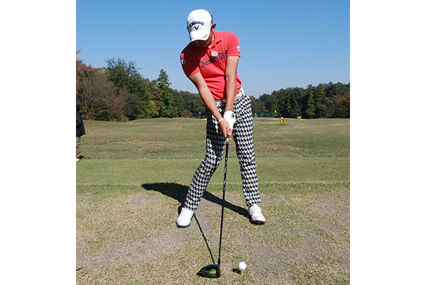 それほど飛ばそうと思っていなくても、アベレージゴルファーの多くは、ボールを打ちにいって体が前に突っ込み、頭も前に出てしまうというミスを頻繁にやっています(写真②)。このようなミスを防ぐためにも、“頭とボールを離して打つ”ことを意識しましょう。そうすれば目一杯振り回しても、大きく芯を外れることはないはずです。