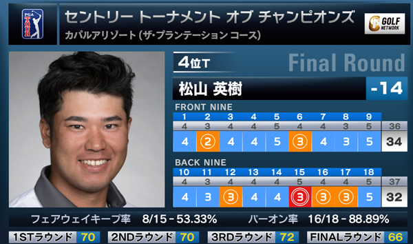 米男子ツアーのセントリートーナメント オブ チャンピオンズは現地時間7日、ハワイ州のザ プランテーション コース at カパルア リゾートを舞台に最終ラウンドの競技を終了。松山英樹は7アンダー66をマークし、通算14アンダー4位タイで今季初戦を終えた。