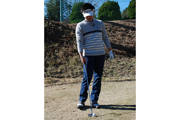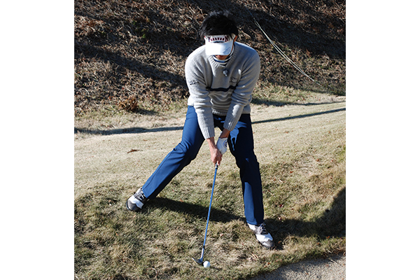 具体的には、「ボールのライはどうなっているか」(写真①)、「スタンスは普通に取れるか」、「ボールを上げなければいけないのか、それとも転がせるのか」、さらに、ボールが落ちたところから下りなのか上りなのかなど、グリーンの状況も考えながら、どんなアプローチをするかを判断します。
