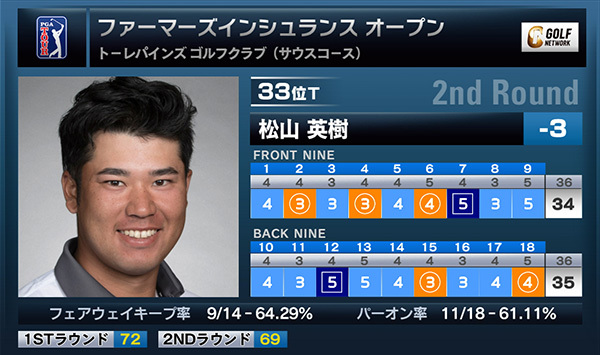 前日84位タイで終えた松山英樹はこの日、前半から2番、4番、6番でバーディを奪うと、後半も1つスコアを伸ばすなど、トータル5バーディ、2ボギーの「69」でホールアウト。通算3アンダー33位タイに浮上し、予選通過を決めている。